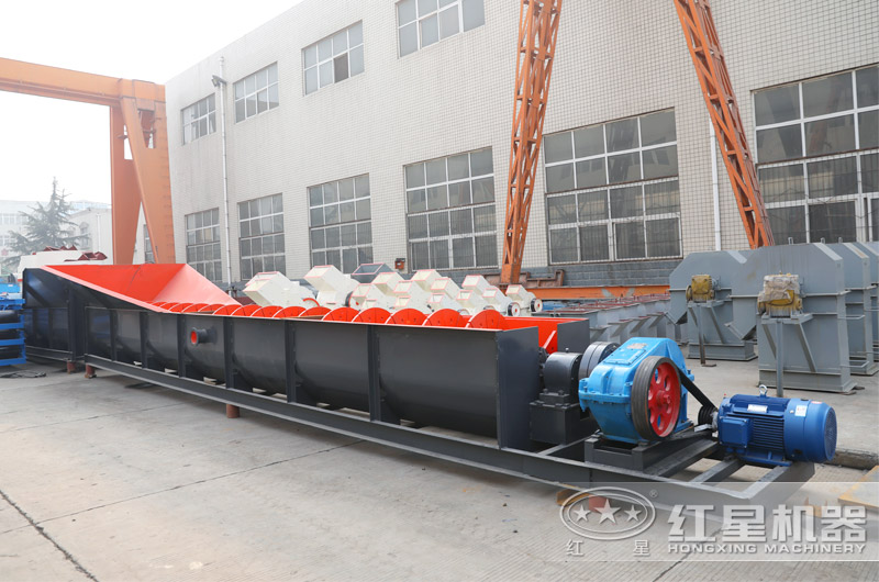 2、螺旋洗石機體型較長,采用臥式結(jié)構(gòu)布置,處理量也更大,多用于大型砂廠,該設(shè)備使用螺旋推進石子而使石子與水和泥土分離,因而石子干凈但產(chǎn)量略低。