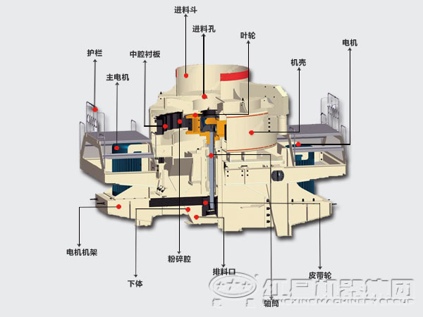 制砂機一般結構:制砂機主要由進料口、溢料裝置、轉子、破碎腔、驅動裝置及機座這幾大部分組成。其工作原理是:物料由進料口進入破碎機,在破碎機頂部由溢料裝置將物料分為兩部分,一部分經溢料口進入破碎腔,另一部分直接進入轉子,物料以50-80m/s的速度從轉子內三個均布的流道口發射出去,與溢料流發生碰撞,然后一起沖向破碎腔內的物料墊,被物料墊反彈,斜向上沖擊到破碎腔的頂部,又改變其運動方向,偏向下運動,與溢流石料重新組合,這樣每塊物料在破碎腔內受到兩次甚至多次破碎作用,而后從破碎腔落下由排料口排出。在整個破碎過程中實現的是物料與物料的碰撞,有效地減少了磨損。